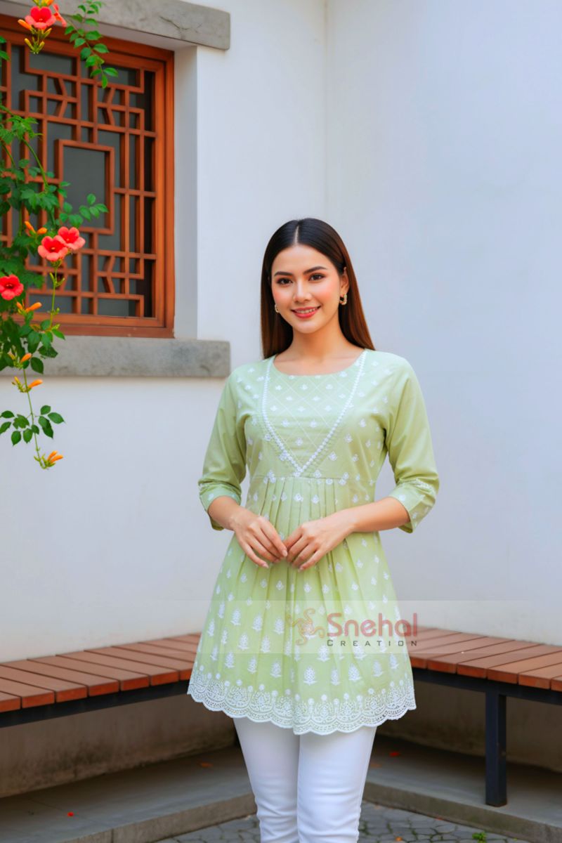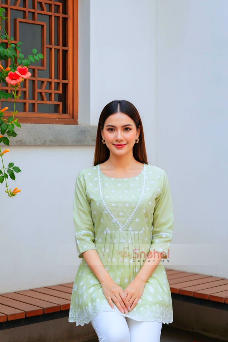 Elegant chikankari embroidered short kurti featuring a flattering peplum design, lace-embellished designer neckline, and comfortable 3/4 sleeves. Perfect for everyday ethnic wear, office wear, and casual occasions.