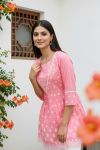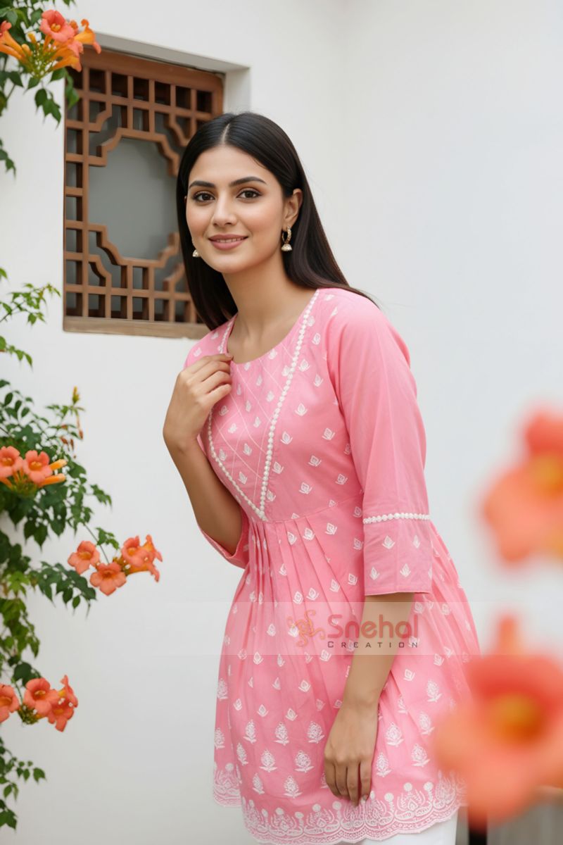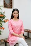 Elegant chikankari embroidered Rose Pink short kurti featuring a flattering peplum design, lace-embellished designer neckline, and comfortable 3/4 sleeves. Perfect for everyday ethnic wear, office wear, and casual occasions.