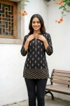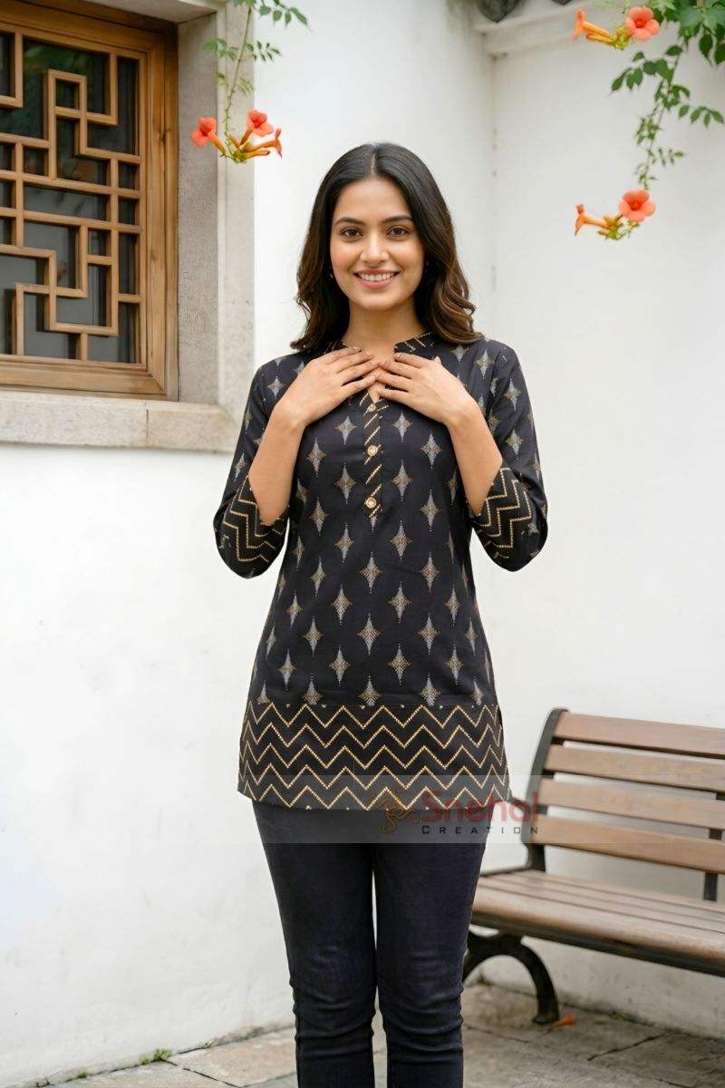 Enhance your everyday style with this elegant black short kurti crafted from soft and breathable rayon fabric. Featuring a unique geometric mix and match print, this kurti adds a modern twist to traditional wear. The stylish ban collar and front button detailing give it a smart and contemporary look.