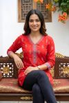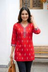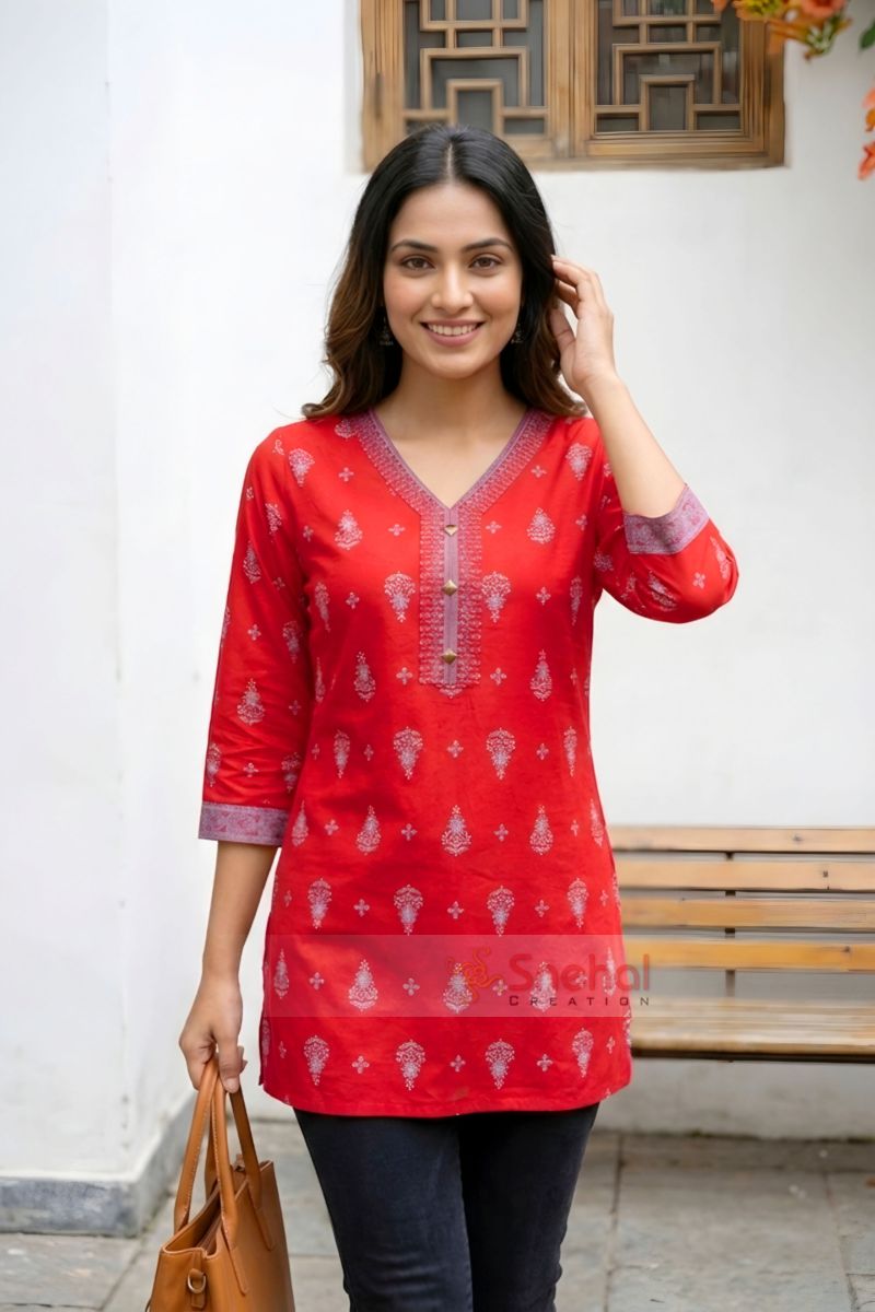 Elevate your everyday style with this elegant red color short kurti crafted from soft and breathable rayon fabric. Featuring beautifully designed ethnic motif prints, this kurti adds a touch of traditional charm to a modern silhouette.