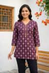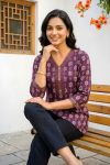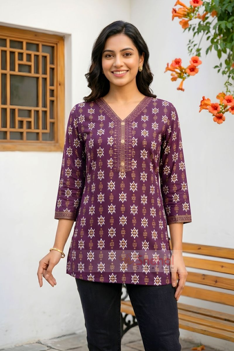 Elevate your everyday style with this elegant wine color short kurti crafted from soft and breathable rayon fabric. Featuring beautifully designed ikkat prints, this kurti adds a touch of traditional charm to a modern silhouette.