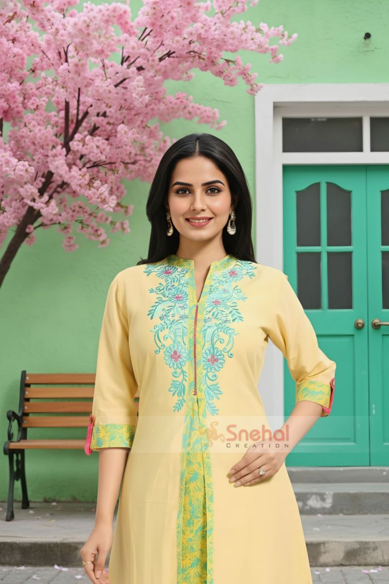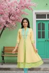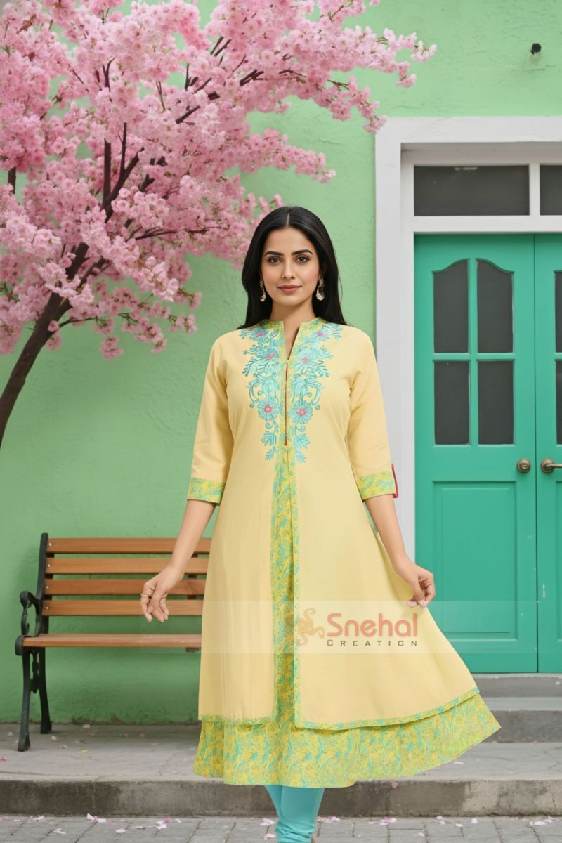 Come the party season and the hunt for a good looking unique piece of clothing starts for women everywhere. This Yellow Designer Layered A-line Long Tunic with Embroidery from Snehal Creations can be the perfect solution to your vows. A narrow ban collar decked in beauteous embroidery, this A-line tunic runs three fourth and has roll-up sleeves style. The tunic is layered with embroidered base fabric and a plain upper layer to provide a designer edge.