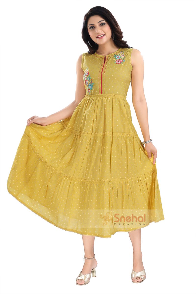 Swirl around like breeze in this Yellow Flared Long Kurti With Embroidery Work from Snehal Creations. The piece is sleeveless and has round neck. The cotton fabric used is printed in an ethnic fashion in yellow. Embroidery work adorn the neckline of the tunic.